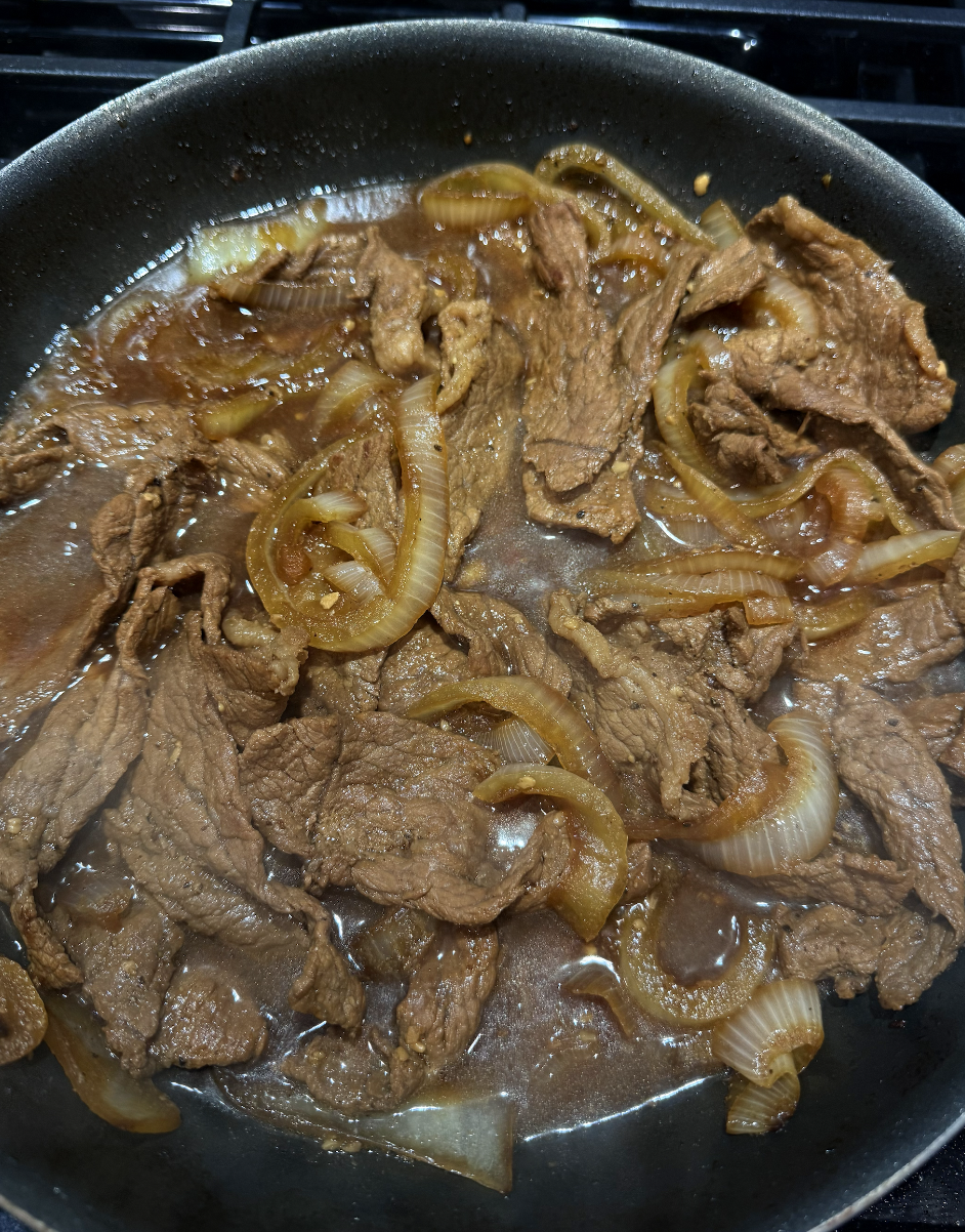 Return the beef to the pan with the onions. Pour in the leftover marinade and add an extra splash of soy sauce if needed. Let it simmer until the sauce slightly thickens and coats the meat beautifully.Add veggies (optional)